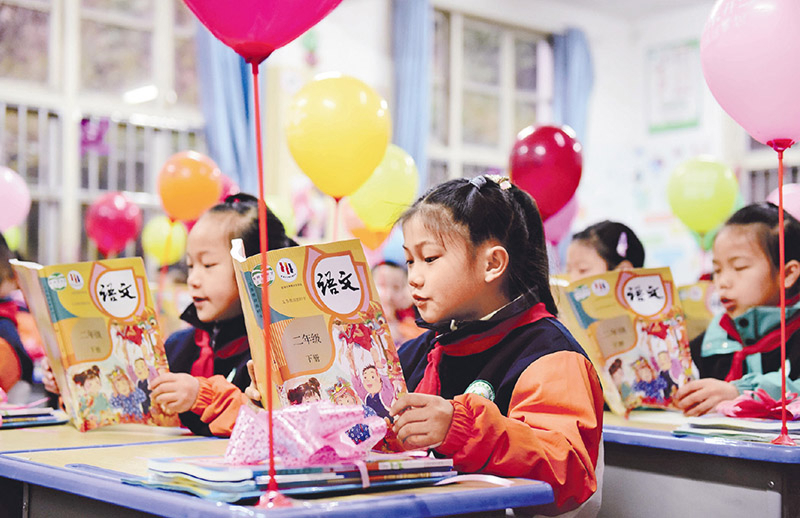 近年来,各地加快推广普及国家通用语言文字,全面推行使用国家统编教材。图为2025年2月17日,在贵州省黔东南苗族侗族自治州从江县城关第三小学,学生们正在阅读刚领到的新课本。 视觉中国 石宏辉/摄